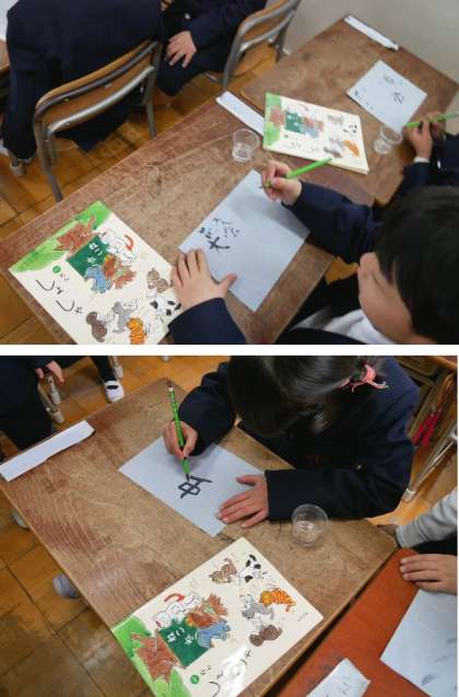 1年生の書写についている、水しょ用紙を使って練習しています。水ふでで書くと字が書けますね。乾くと何回でも練習できます。