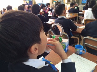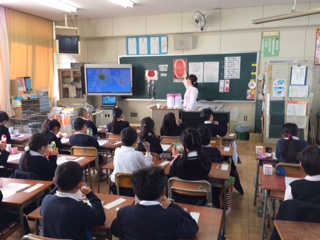 2年生が、歯科衛生士さんから歯の大切さを教えて頂いた後、歯の磨き方を練習しました。歯垢チェックの赤い薬を使って、歯垢が歯磨きによって落とせているかどうかを調べました。正しい歯の磨き方を鏡を見ながら確認しました。