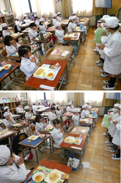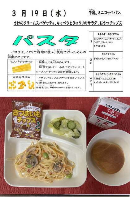 今日の献立は、さけのクリームスパゲッティ、キャベツときゅうりのサラダ、おさつチップス、牛乳、コッペパンでした。