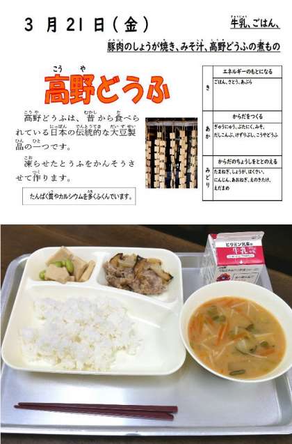 3月21日 今日の給食は! 公開日 2025/03/21 更新日 2025/03/21 学校生活 今日の献立は、豚肉のしょうが焼き、みそ汁、高野どうふの煮もの、牛乳、ごはんでした。今年度の最後の給食でした。おいしい給食を毎日ありがとうございました。 いいね(0)