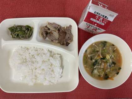今日の給食は、「豚肉のしょうが焼き・とうふのみそ汁・じゃこピーマン・ごはん・牛乳」でした。