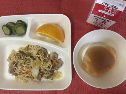 今日の給食は、「焼きそば・きゅうりのしょうがづけ・あまなつかん・ミニコッペパン・牛乳」でした。
