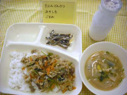今日の献立は「他人丼、みそ汁、ごまめ、牛乳」です。