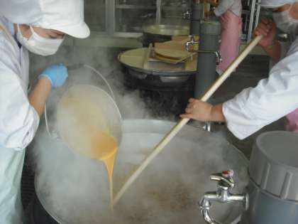 他人丼は、牛肉や卵がたくさん入っています。給食ではトロトロの卵では出せません。85度以上の温度になるまで加熱するので、しっかりかための卵に仕上がります。