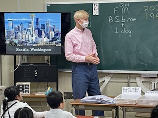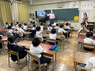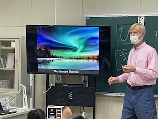 C-net(ネイティヴ)の先生と触れ合いました。オーロラの写真が映し出されると、「きれい」とどよめいていました。色や動物などの写真を見ながら、英語で触れ合いました。