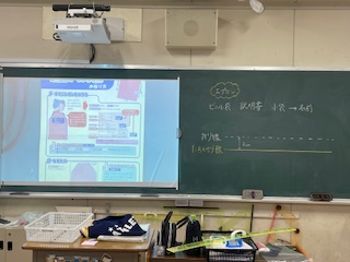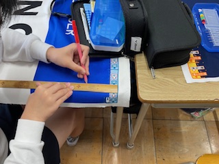 6年生は家庭科の学習で、エプロン制作に取り組んでいます。布地に仕上がり線を引き、しつけの準備をしています。