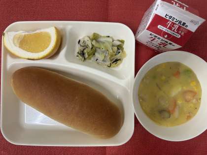 今日の給食は、「鶏肉とコーンのシチュー・キャベツのひじきドレッシング・かわちばんかん・黒糖パン・牛乳」でした。