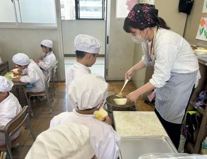 シチューは、鶏肉とベーコンを主材にじゃがいも・たまねぎなどの野菜・マッシュルームを使用し、具だくさんでコーンの甘みもしっかり感じられ、大変好評でした。