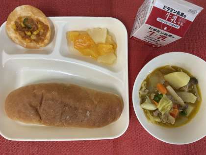 今日の給食は、「豚肉と野菜のカレースープ煮・変わりピザ・ミックスフルーツ(缶)・レーズンパン・牛乳」でした。