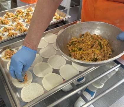 変わりピザは、ぎょうざの皮に新食品の乳製品が含まれていない「乳なしチーズ」とツナ・コーン・ピーマン・ピザソースを混ぜ合わせた具をのせ、焼き物機で焼いています。乳アレルギーがある人も食べることができます。