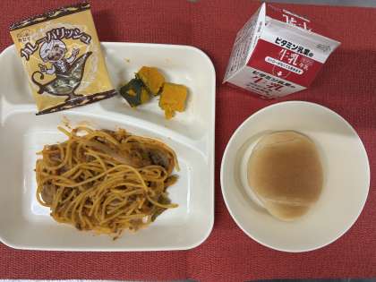 今日の給食は、「ミートソーススパゲッティ・焼きかぼちゃ・カレーフィッシュ・ミニコッペパン・牛乳」でした。