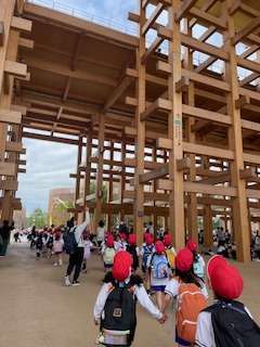 5月27日(火)に2年生が大阪・関西万博での活動を実施しました。朝は少し肌寒い天候でしたが、会場に入るころには汗ばむほどの好天に恵まれ元気に活動しました。まず、コモンズB館を4人グループで見学した後、セネガル館・バングラデシュ館を見学しました。