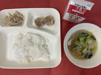 今日の給食は、「焼きシューマイ・鶏肉とはるさめのスープ・ツナともやしのいためもの・ごはん・牛乳」でした。