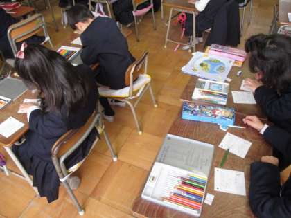 6年生が出発した学校では、1〜5年生のみんなで、たてわり班でお世話になった6年生に向けてメッセージカードをつくっています。