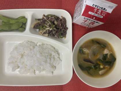 今日の給食は、「チンジャオニューロウスー・中華みそスープ・えだまめ・こはん・牛乳」でした。