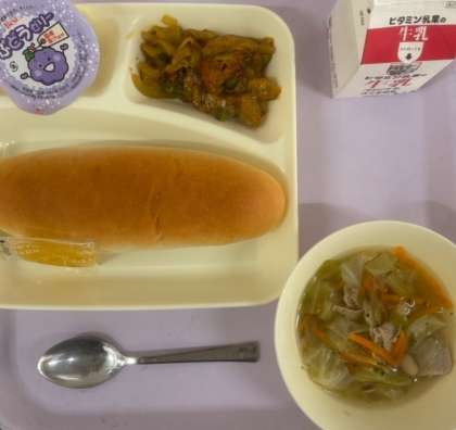 今日の給食は、「カレーマカロニグラタン・てぼ豆のスープ・ぶどうゼリー・コッペパン・マーマレード・牛乳」でした。