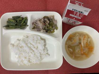 今日の給食は、「豚肉の梅風味焼き・五目汁・さんどまめのごまあえ・ごはん・牛乳」でした。