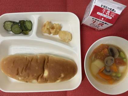 今日の給食は、「いかてんぷら・フレッシュトマトのスープ煮・きゅうりのバジル風味サラダ・おさつパン・牛乳」でした。
