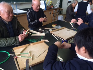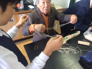 別のグループは、老人会のおじいちゃんから「ぶんぶんごま」と「ガリガリプロペラ」の作り方を教えて頂き、楽しく遊びました。