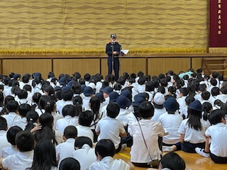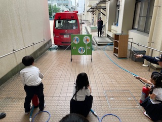 雨天のため予定を変更しながらですが、消防署・区役所・地域の防災リーダーの皆様のご協力のもと、防災クイズや水消化器体験、心肺蘇生法・AED訓練など、各学年の実態に応じた防災学習に取り組みました。学習終了後には、引き渡し訓練も実施しました。