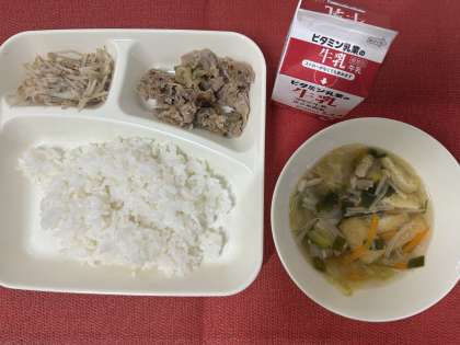 今日の給食は、「豚肉のごまみそ焼き・五目汁・ツナともやしのいためもの・ごはん・牛乳」でした。