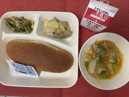 今日の給食は、「鶏肉のカレー風味焼き・スープ・ツナとさんどまめのソテー・コッペパン・ブルーベリージャム・牛乳」でした。