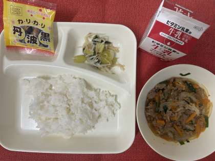 今日の給食は、「マーボーはるさめ・チンゲンサイともやしの甘酢あえ・いり黒豆・ごはん・牛乳」でした。
