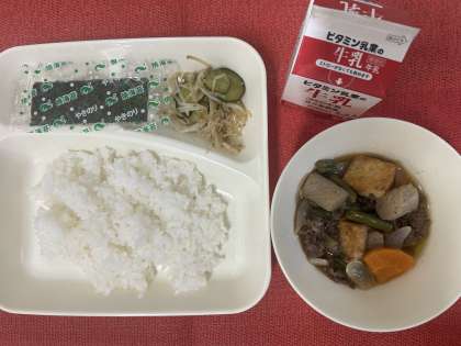 今日の給食は、「牛肉と野菜のいため煮・きゅうりともやしのおひたし・焼きのり・ごはん・牛乳」でした。