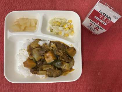 今日の給食は、「夏野菜のカレーライス・サワーソテー・洋なし(カット缶)・ごはん・牛乳」でした。