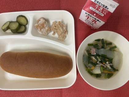 今日の給食は、「鶏肉のからあげ・ハムととうがんの中華スープ・きゅうりのピリ辛あえ・黒糖パン・牛乳」でした。