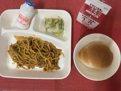 今日の給食は、「カレースパゲッティ・グリーンアスパラガスとキャベツのサラダ・発酵乳・コッペパン・牛乳」でした。