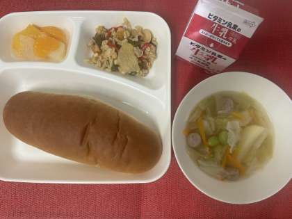 今日の給食は、「押麦のチキンパエリア・ウインナーとキャベツのスープ・ミックスフルーツ(缶)・黒糖パン・牛乳」