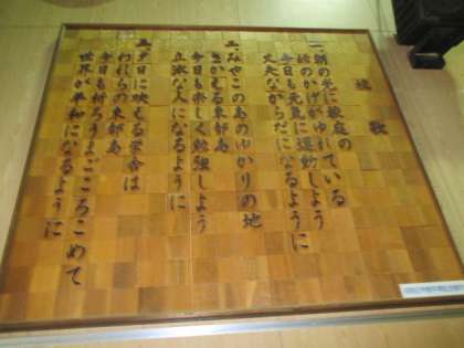 下の写真は、昭和61年度の卒業制作です。校歌の歌詞です。講堂の前面に掲げてあります。校歌を歌うときは、みんなが見つめています。
