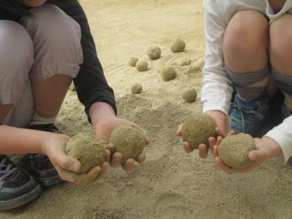 曇り空ですが、春の暖かな空気に包まれて、子どもたちがのびのびと遊んでいます。