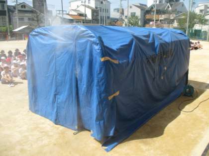 全校の避難訓練の後、4年生が「煙中体験」を行いました。