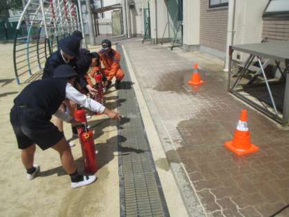 5年生は、水の入った練習用の消火器で、消火器を噴射する練習をしました。