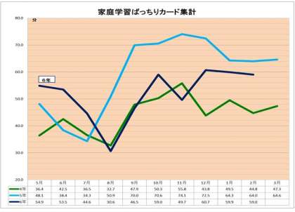 新5年生、新6年生には、昨年度の学習時間の移り変わりグラフを持ち帰らせましたので、ふり返えりにご活用ください。