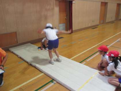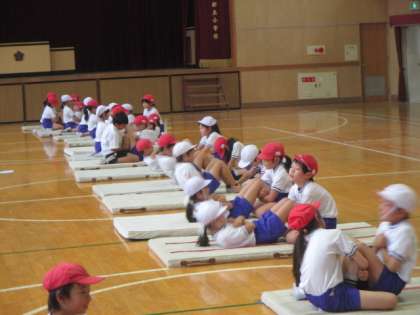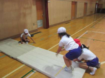 今日の講堂では、3年生が「上体おこし」と「立ち幅跳び」に挑戦しました。