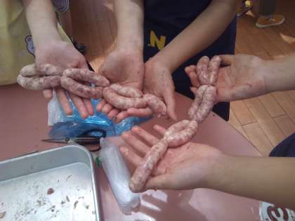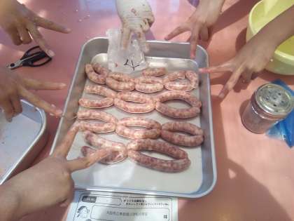 けっこう上手に作っています。班によってレベルは違いますが、自分たちで作ったソーセージは最高の味でしょう。