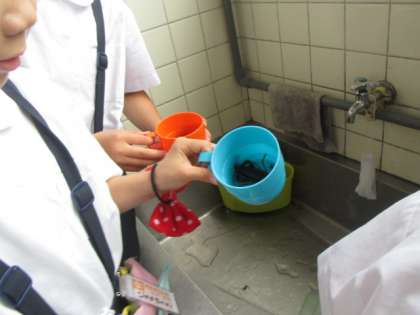 2年生の教室の前を通りかかると、コップを持った子が水道で何かをしています。