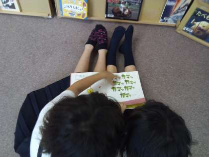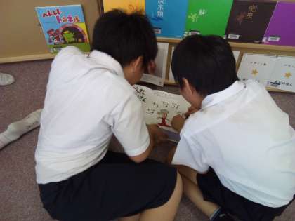 いろいろな種類の絵本がいっぱい。5年生も、楽しんでいます。