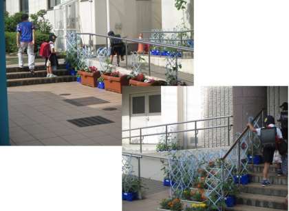 2枚目の写真は、登校した子どもたちが玄関の植物の様子を気にかけているところです。