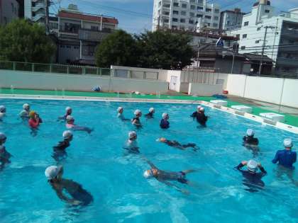 5年生が、服を着たままプールに入っています。本校では毎年、全学年で着衣泳の時間を設定しています。