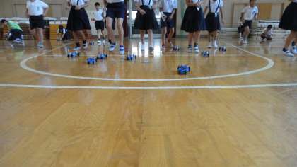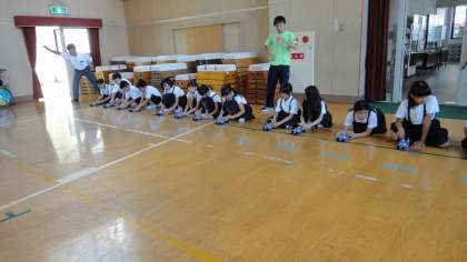 今日は、実験で使った電池とモーターを使ってモーターカーを作って走らせました。