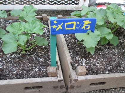 下の写真はメロンです。なんと、管理作業員さんが給食に出ていたメロンの種からここまで育てたんです! 実がなるには、花が咲いて受粉するする必要がありますが、どこまで育つか楽しみです。