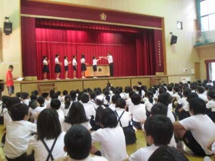 終業式の前に、読書表彰をしました。高学年も1万ページに達した子がいましたよ!夏休みも読書にはげみましょう(^O^)/