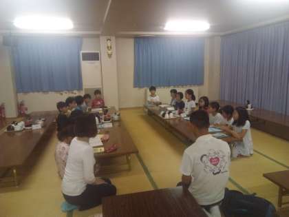 楽しいキャンプファイヤーも終わり、一日目最後の反省会を行なっています。今日の失敗を繰り返すことがないよう、しっかり話し合いました。この会議の内容を全員に伝えて、明日の行動にいかします。