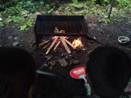 全10班のうち、5つの班が点火に成功。その火で、次はカレー作りが始まります。火を絶やさぬようにしながら、カレー係は慌てて調理しています。点火がまだの班は、必死で頑張っています。