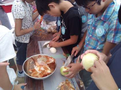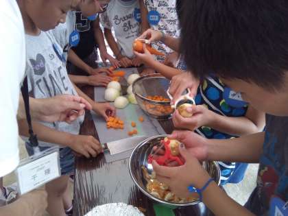 カレーづくりが始まりました。今日の晩ご飯です。班で協力して頑張って作ります。各班の指導は、班長のお母さんが担当。役割分担を決めて、さあスタート。