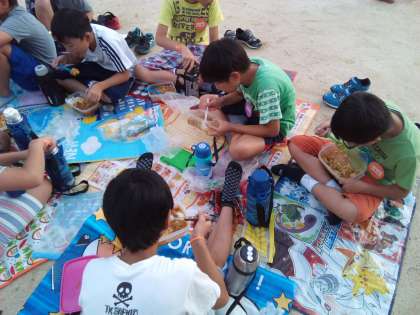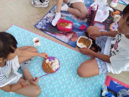 運動場で自分たちで作ったカレーライスを、仲間とともに美味しくいただきます。